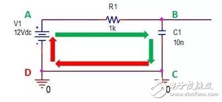 其隐含一个问题就是在PCB上其实V1的负极和C1的负极是有一条线(PCB layout工具软件中用的词比较准确,Trace,踪迹/轨迹)。