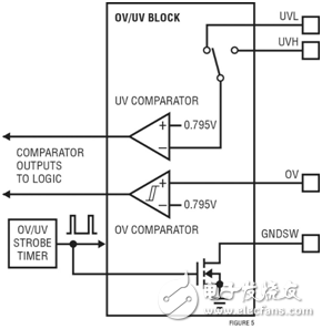 降低 LTC4231 静态电流的第二种方法是,每隔 10ms 对输入电压采样一次,以确定输入电压是否已经低于欠压门限或高于过压门限。该器件还为外部输入电压的电阻分压器提供一个选通接地连接 (GNDSW) (图 5)。偶尔采样使电阻分压器的电流消耗降低50倍,这是采样周期 (10ms) 除以采样窗口 (200µs) 得出的。监视 UVL、UVH 和 OV 引脚的比较器在采样窗口中接通,从而使平均电流消耗也降低 50 倍。10ms 采样周期对电池而言能够很好地发挥作用,因为随时间流逝其电压变换很缓慢。不过,如果在启动时发生欠压或过压情况,LTC4231 就保持 MOSFET 断开,以隔离超范围电压,防止其传播到负载。