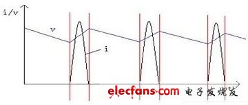 一般开关电源为容式滤波,在输入与整流滤波部分电磁噪声主要是由整流过程中造成的电流尖峰、电压波动所引起的。正弦波电源经过电源滤波器进行差模、共模信号衰减后,由整流桥整流、电解电容滤波,得到的电压作为高频逆变部分的输入电压。由于滤波电容的存在,使整流器不象纯整流那样一组开通半个周期,而是只在正弦电压高于电容电压时才导通,造成电流波形非常陡峭,同时电压波形变得平缓。电流、电压的波形如图2所示。