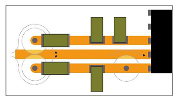 每个这些通孔都会在内接地层上产生大于通孔直径自身的禁入区,提供制造空隙。这些禁入区很容易在回流路径上造成中断。一些通孔彼此靠近则会形成接地层沟,顶层CAD视图看不见,这将导致情况进一步复杂化。图2两个电源层通孔的接地层空隙可产生重叠的禁入区,并在返回路径上造成中断。回流只能转道绕过接地层禁入区,形成现在常见的发射感应路径问题。
