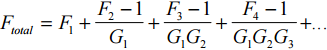 F的以上的噪声因素的每个连续阶段的收益是G的阶段。噪声系数或收益都以日志形式。当这个方程,这反映了所有组件噪音到天线端口。因此,可用的噪音从一节使用噪声图可以直接退化。