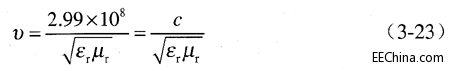 实际当中,几乎所有材料的相对磁导率都为l,所以可以把式(3-23)中磁导率υr这一项忽略。除了空气,其他材料的介电常数都是大于1,所以传输线中的光速总是小于2.99×10(8)m/s: