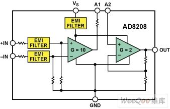 AD8208的更多详情:AD8203(图A)是一款单电源差动放大器,非常适合在大共模电压情况下放大和低通滤波小差分电压。采用+5 V单电源供电时,输入共模电压范围为-2 V至+45 V。该款放大器提供增强的输入过压和ESD保护,并内置EMI滤波功能。