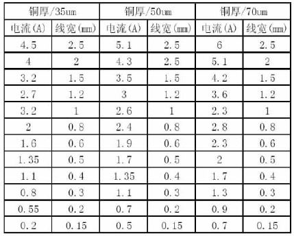 表1 PCB设计铜铂厚度、线宽和电流关系