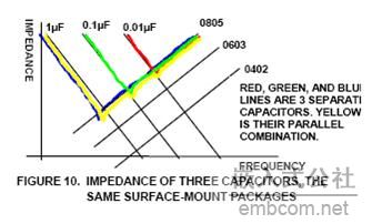 上图是同一容值的不同封装的阻抗曲线,封装越大ESL越大,自谐振频率越小。