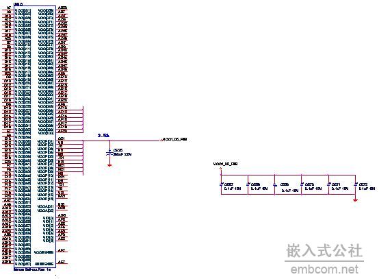 VCC1_05_FSB进入CPU前先进行一个220uF和6个0.1uF的旁路滤波。