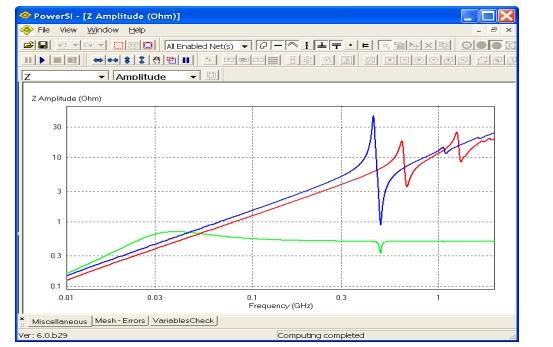 图4显示了在三种不同设置下,用Sigrity PowerSI计算得到的电源供电系统的输入阻抗: