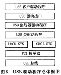 Windows提供了USB的系统类驱动程序,他处理USB上的所有底层通信,这样其他驱动程序就有了一个定义好的接口可以使用。图5中USB类驱动程序使用UHCD.SYS或OHCI.SYS分别驱动两种类型的控制器UHCI(USB Host Controller Driver)和OHCI(Open Host Controller Interface)。当PCI枚举器发现USB主机控制器后,就会装入相关的驱动程序。
