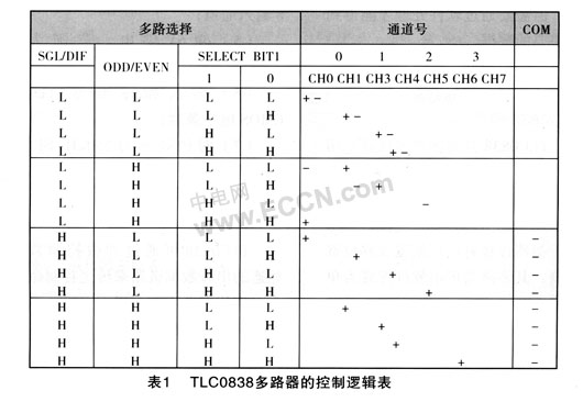 TLC0838可通过和微控制器相连的串行数据链路来传送控制命令,在使用前需要对通道进行选择和输入端进行配置,其控制逻辑表如表1所列。