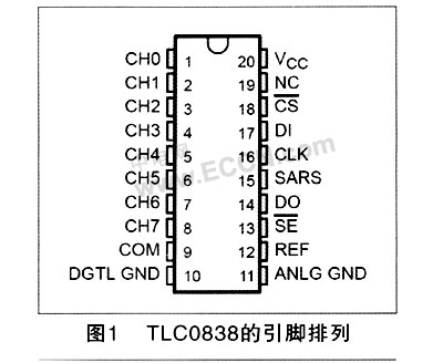 TLC0838的引脚排列如图1所示,其中CH0~CH7为模拟输入端;Cs为片选端;DI为串行数据输入,该端仅在多路器寻址时(MUX Settling Time)才被检测;DO为A/D转换结果的三态串行输出端;CLK为时钟;SARS为转换状态输出端,该端为高电平时,表示转换正在进行,为低电平则表示转换完成;REF为参考电压输入端;VCC为电源;DGTLGND为数字地,ANGL GND为模拟地,COM公共端;/SE为数据保持,输出,该端为高电平时,数据保存在数据线上,该端为低电平时,数据输出。
