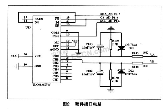 在紧急电话系统,通过单片机I/0引脚与有TLC0838连接,只需3根引脚,该方式在完成模、数转换功能的前提下省却了大量外部扩展器件,减少了印刷电路板的面积,同时也增强了抗干扰能力,降低了硬件成本。