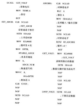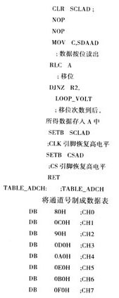 工作时,单片机通过编程产生串行时钟,并按时序发送与接收数据位,完成对通道数据的写人设置和转换结果的读出。与TLC0838有关的代码截取如下: