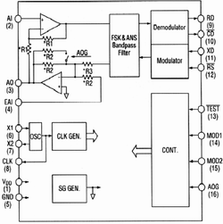 发送电路包括调制器,发送滤波器和发送放大器。要发送的二进制数据信号首先从XD端进入调制器,调制器实际上是一个可控的频率合成器,经3.579545MHz时钟分频产生所需的频率。然后根据输入的数据和调制解调器所处的工作状态形成FSK信号送入发送滤波器以及滤除信号的高频分量和杂波。由发送滤波器输出的信号经过发送放大器后,变成幅度不随电源电压变化的FSK信号输出到线路。