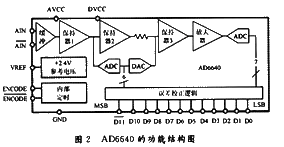 AD6640是一个高速度、高性能、低功耗,单片式12位AD转换器,内含采样保持电路和基准源。他由单电源+5 V供电,TTL/CMOS兼容电平输出,中频采样频率的典型值为70 MHz(多信道时)和200 MHz(单信道时),采样速率可达65 Mb/s,信噪比SNR的典型值为68 dB,SFDR值为80 dB,功耗为710 mW。AD6640采用两级子区式的转换结构,既保证了精度又降低了功耗,其功能模块如图2所示。从图2可以看出ADC所有需要的功能,包括输入缓冲,跟踪保持放大,数字纠错以及2.4 V参考电压都由芯片提供,从而使其设计变得更轻松。