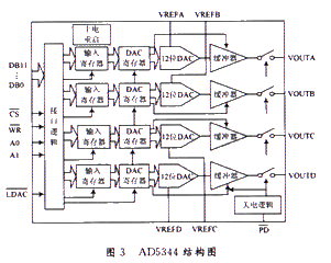 系统所用的DAC为ADI公司的AD5344,他是一种低功耗12 b数模转换器。该芯片可应用于便携式电池电源仪器、可编程电压和电流源、可编程衰减器、工业处理控制器以及数字放大和补偿调节等方面。图3为其内部结构原理图。AD5344有4路12 b DAC,可在2.5~5.5 V之间正常工作,在外接+3 V电压时典型电流值为500μA,并且具备进一步将电流降至80 nA的节电模式。他的输出缓存可将输出驱动到两个电源轨道之上。通过A0和A1可控制选择哪一路输出。