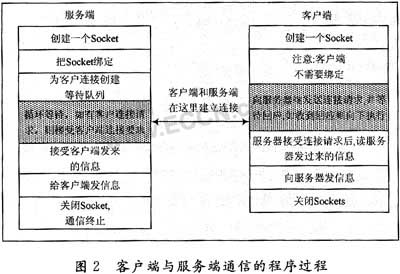 软硬件仿真器之间的通信是协同验证中的关键技术。由于软件仿真和硬件仿真使用独立的两个进程,因此可以使用Unix下的进程间通信(Inter Process Communication,IPC)技术来实现软硬件仿真器之间的信息交互。常用的几种Unix IPC有无名管道,有名管道(FIFO)和Unix套接字(Socket)。无名管道是Unix中最常用的IPC方式,优点是非常简洁,弱点是他只能在相关的,有共同祖先的进程间使用;有名管道(FIFO)和无名管道的区别在于他是持久稳定的,而且可以让无任何关联的进程问交换数据;套接字是一种抽象数据结构,用以创建一条在没有关联的进程间发送、接收消息的通道(连接点),一旦通道建立之后,被连接起来的进程就可以通过普通的文件系统存取例程来进行通信了。在通信的两方中,一方称为客户程序(client),另一方称为服务程序(server)。建立过程如图2所示。对比上述3种通信方式的特点,这里使用UnixSocket来实现两个进程间的通信。