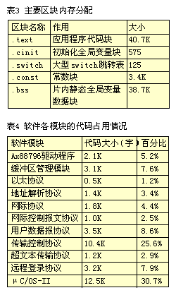 用ANSIC语言和汇编语言在TMS320F2812上编写的网络通信软件全部调试通过,系统软件占用程序空间40.7KB,数据空间38.7KB。表3和表4分别是主要区块内存分配和协议代码占用情况。