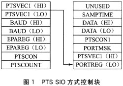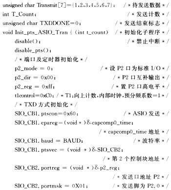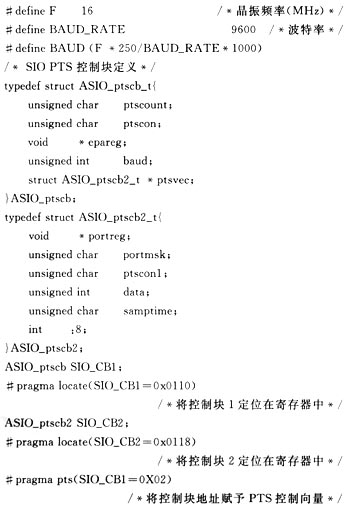 要利用PTS实现串行通信,必须首先定义相应的控制块,并将其定位于能被8整除的首地址处;还要将控制块地址赋给PTS向量。具体实现代码如下: