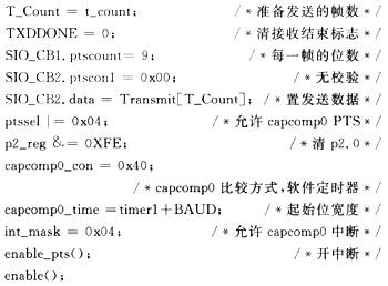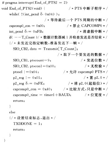 在发送时,要用到EPA中的一个比较模块,或者使用一个捕获/比较模块而使其工作于比较方式下,主要用作发送时产生移位时钟,以保证指定的位周期。其具体过程如下:首先,在指定的发送引脚上产生一个下降沿(为确保产生下降沿,应先对该引脚置1),并根据指定的波特率对EPA比较模块的时间寄存器(CAPCOMPx_TIME或COMPx_TIME)置值,以指定发送的位周期。然后,打开中断和PTS功能,启动数据发送过程;以后每隔一个位周期便会产生一个PTS周期,在每个PTS周期中,将DATA寄存器中的数据逐位移到指定的发送脚上,直到最后一位移出后,产生一次End_of_PTS中断,该帧数据发送完毕。每帧数据的位数在控制块的ptscount中指定。如果需要继续发送数据,就要在中断服务程序中对PTSCB、EPA时间寄存器和相应引脚重新初始化,再次启动发送过程。发送数据保存在transmit数组中,发送帧数,即数据个数由T_Count控制。具体实现代码如下: