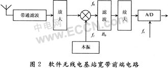 由天线接收到的上行信号,经过了带通滤波器滤除带外信号后,再经过放大和混频,将无法对其进行A/D采样的射频信号(800~900 MHz和1 800~1 900 MHz)转换为中心频率为f0,带宽为B0(B0=20,25,60,75 MHz)的宽带中频信号,并且经过中频滤波器滤除镜像频率,再进行中频放大到A/D所需的足够的信号电平,最后送到A/D转换器进行数字采样。由此可见,图2所示的软件无线电基站前端电路的一个主要特点是宽带化,即他将基站所需接收的整个上行频段同时变换到中频,实现宽带处理。但是这样就对A/D变换器的采样速率和动态范围等性能提出了比较高的要求,如采样速率要高、动态范围要大等。下面讨论图2中几个关键参数(f0,fs,fι,B0)的选取问题。