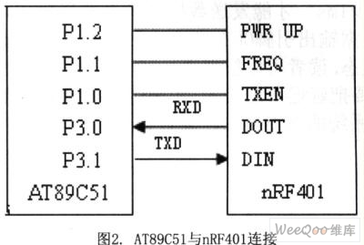 在系统设计中,以Atmel 公司的AT89C51 单片机作为系统控制器与该电路连接。由控制器发出控制信号改变TXEN端口的值,以改变nRF401 的收、发工作状态,nRF40l与AT89C51连接方式如下图2示。