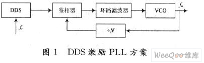 DDS和PLL相结合构成的跳频频率合成器有几种方式:DDS激励PLL方案、PLL内插DDS组合方案和频率转换快捷的组合方案等。本设计采用的是第一种方案,如图1所示。PLL设计成N倍频环,DDS输出直接作为PLL的参考信号。