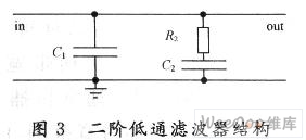 AD9850是采用并行传输方式从计算机接收频率和相位控制字的,这是因为考虑到并行方式传输的速度比串行方式快。总共40位控制字,通过8位数据总线送到AD9850的输入寄存器中,需重复5次。在FQUD信号上升沿调入40位控制字,同时把地址指针复位到第一个寄存器。接着在W_CLK信号的上升沿到来时,把最高的8位数据装入第一个寄存器,并把地址指针指向下一个寄存器。这样,连续5个W_CLK上升沿后,就把40位控制字都装入了寄存器,W_CLK信号不再起作用,直到收到复位信号或FQ_UD信号的上升沿时,才重新开始新一轮的数据装入。鉴相器LMX2306本身就带有一个前置双模分频器(8/9分频)和两个可编程分频器N,R,采用串行输入的方式。在初始化时只要给N寄存器、R寄存器和F功能寄存器输入正确的数据,就可以正常工作了。LMX2306的外部环路滤波器在锁相环路中起非常重要的作用,环路滤波器形式和参数的选取是锁相环设计与调试的关键,在很大程度上决了定环路的噪声、捕获和跟踪性能等。该环路滤波器选用二阶无源比例积分滤波器,其二阶低通滤波器结构如图3所示。