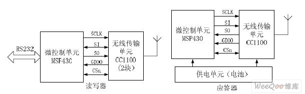 读写器中数据传输单元由两块 CC1100 组成,其中一片工作于315MHz,用于发射单频点载波,形成激活场区,另一片工作于433MHz,用于与应答器进行半双工通信;控制单元采用TI 的超低功耗单片机MSP430,降低了系统功耗。控制单元用于配置CC1100 寄存器,处理CC1100 接收到的数据,并向外提供RS232/485 接口。应答器中数据传输单元为一片CC1100,用来与读写器进行无线通信;控制单元用于配置CC1100 寄存器,并对CC1100 的状态进行管理。