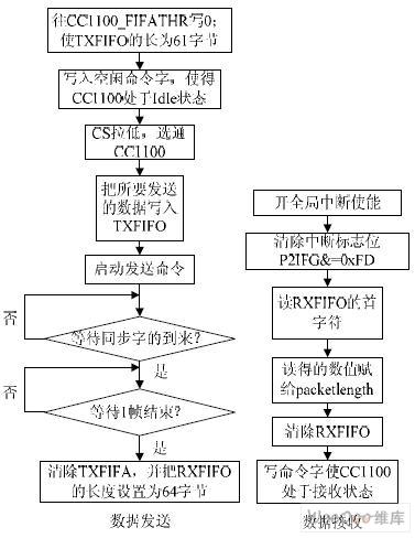 CC1100 与MSP430 采用SPI 接口连接,图1 中已经给出了它们之间的连接方式。SPI 总线接口技术是一种高速、高效率的串行接口技术,主要用于扩展外设和进行数据交换。MSP430控制CC1100 进行数据发射和接收数据的流程如图2 所示。