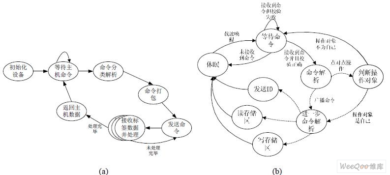 读写器部分软件的工作流程如图 3(a)所示,读写器一直等待主机命令,接收到主机命令后,根据主机需求将命令解析成读写器对应答器相应操作,例如:提取场内所有应答器ID,对场内某些应答器的存储器进行读写等。命令发送后,读写器等待应答器的应答数据,与应答器进行无线通信。当读写器执行完主机命令,完成于应答器的通信后,将需要返回的数据或状态通过读写器与主机之间的接口上传主机,继续等待新的主机命令。