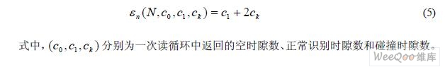 在实际应用中,场内应答器数目是未知的,因此必须对场内应答器数进行估计。图中可以看出每个时隙可能有三种状态:空时隙、正常通信时隙和碰撞时隙。可以根据式(5)对应答器数进行估计。