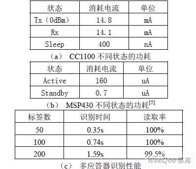 由于应答器靠电池供电,因此应答器的工作时间是系统重要指标。MSP430 和CC1100 在不工作时刻已处于休眠状态,从而达到低功耗的目的。表1(a)和(b)分别说明了MSP430 和CC1100 在不同状态下的耗电量。假设应答器有1%的时间处于场内应答,则可以计算,应答器工作时间为2 年,满足应用要求。