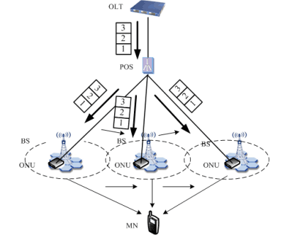 在EPON提供基站连接的网络中,当相邻基站在同一个EPON网络中时,能够比较容易地实现软切换。在下行方向,所有信道的数据都通过广播的形式发送到所有的ONU/基站,而且一个EPON网络中所有的E1通道/基站是同步的(都与OLT同步)。当基站检测到MT的时候,它就开始向MT发送数据包。当MT将要在两个基站之间切换的时候,由于新基站检测到MT之后,可以立刻向MT发送其需要的数据包(因为这两个基站连接的ONU都可以收到下行的所有数据),而且这些包与原基站发送的包是同步的。所以MT可以很快建立与新基站的连接,之后再断开与原基站的联系,实现软切换。因此,采用EPON作为基站传输网络,可以不需要很复杂的协议,就能容易地实现MT在小区间的软切换。