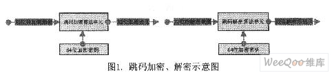 跳码的实现核心是非线性加密算法,利用32位非线性反馈移位寄存器(NLFSR)和64位密钥组成的加密单元,可实现对输入32位二进制数据的加密,加密后的输出是32位二进制随机数。输入有一位变化,加密后的输出统计上将有一半以上的位发生变化,具有相当高的随机性。图1是跳码加密和解密的示意图: