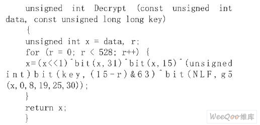 跳码解密单元是加密单元的逆操作。依据图3,解密时,将欲解密的32位二进制跳码Y存入32位SR中,选取32位SR的0、8、19、25、30位和固定32位二进制数据OX3A5C742E组成非线性函数NLR的输入,NLR的输出、SR的15、31位、以及64位key FSR移位后的15位,这些位数据异或(XOR)后产生的1bit数据作为32位SR的0位。循环此操作528轮后,32位SR中的数据即为解密后的数据X。这里给出用VC6.0对该解密算法的实现: