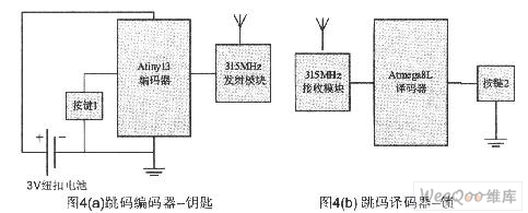 图4中,钥匙和锁进行单向通信,即按下钥匙按键1时,钥匙向锁发送加密后的跳码数据,锁收到后解密,并判断执行。钥匙是低功耗模块,它大部分时间处于休眠状态,每当按键1按下时,钥匙被唤醒,发送加密后形成的跳码数据。钥匙要便于携带,因此要求体积小,待机时间长,故这里选用Atmel公司的Atiny系列单片机,并由钮扣电池供电。锁对功耗和尺寸不敏感,故这里选用Atmega8L单片机,供电方式可以灵活一点。