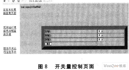 该监控主页面左侧显示有3个模块:重新登陆页面;观测站远程环境信息检测系统,能方便实时地查询现场的环境状态,如图7所示;现场开关的远程监控系统,可以控制3个开关量的开关,如图8所示,并能查询它们当前状态,设置监控页面每隔15 s动态刷新一次,如图9所示,可实现实时的远程监控。系统默认的是当前的实时查询,提交查询后,用户可以得到设备的运行情况。