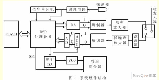 通信处理模块和外围的射频电路及相应的辅佐器件组成通信单元,包括发射和接收两大部分。系统采用零中频方案,将频率较高的处理放在模拟器件中完成,可以降低AD、DA采样频率,减少数字运算工作量,达到节省功耗的目的。在射频模块中采用一次上变频和一次下变频的处理,可以减少系统复杂度,节省硬件体积。在收发切换上采用电子开关进行时分双工,收时不发,发时不收,可以有效减小系统体积,且和协议配合实现通信功能时可节省功耗。射频的频率合成器可对收发频率进行设置,实现多个频点的信息收发。需要注意的是,由于该系统前端滤波处理抑制度不够,故可能存在较多的大信号干扰,这对AD器件的转换精度提出了较高的要求,同时为达到较好的效果,需要在DSP内进行数字滤波。DSP可对AGC和VCO进行控制,实现对信号幅度及本地载波频率相位的调整。