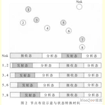 各个节点收发时间的交错可减少系统冲突的概率。设传感网中8个节点均与Sink节点通信,则Sink节点和其他节点的状态设置如图2所示。