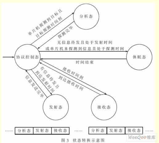 系统开机后,首先进入协议控制态,协议控制态根据约定流程进行状态转换,并将单片机探测目标中断优先级设置到最高,一旦该中断触发,即通过硬件DMA将数据信号送入RAM中存储,等待处理。当发射时间片到时,协议控制模块检测是否有信号待发送。如无,则进入休眠态;如有,则进入发射状态,发射完毕后返回协议控制态;如仍处于发射时间段,协议控制模块控制转入休眠态。当接收时间片到,系统进入接收态,随时进行信号的接收,直至接收时间片结束为止。当进入目标探测时间片时,对存储的数据进行处理,分析是否存在信号,并将分析结果上报给协议控制模块。