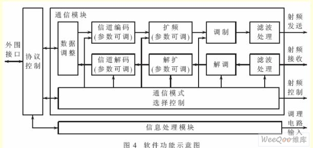 目前在WSN节点的设计上,大多将信息处理模块与通信模块隔离开来,分别采用不同的硬件进行处理,通信模块基本采用现有成熟产品。这样设计的系统,缺乏整体考虑,难以在体积功耗上进行最小化的设计,且由于通信模块固定,不能同时适应具有不同传输数据量、不同传输速率和不同误码率要求的系统。而这些条件是WSN中是应满足的常见要求。