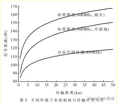 以Hata模型为例说明在其他环境下的对比情况。Hata模型是根据Okumura曲线图所作的经验公式,频率范围为150MHz"1 500MHz,以市区传播模型损耗为标准,其他地区在此基础上进行修正,适用于半径超过1km的大区域移动系统。