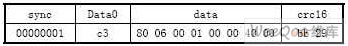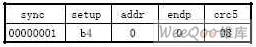 主机发起的setup包,使用默认的地址0,端点0。其中SYNC字段为同步序列数据域,固定为01H,紧接着为标识符数据域PID字段,用来表示数据封装包的类型,可分为令牌、数据、握手或特殊四种封装包类型。其中令牌封装包细分为OUT,IN,SETUP,SOF四种封装格式。随后为地址数据域ADDR字段,用来寻址高达127个外围设备,每个设备只有对应唯一的地址,ENDP字段为端点数据域,最多可寻址32个端点,它仅在IN,OUT,SETUP令牌封装包中,最后为CRC校验和。
