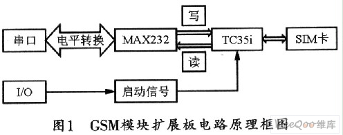 TC35i基带处理器集成有一个标准的SIM卡接口。为扩展外部SIM卡接口,该接口还连接到ZIF连接器。TC35i在GSMll.ll为SIM卡预留5个引脚的基础上预留了6个引脚,所添加的CCIN引脚可用来检测是否插有SIM卡;当有SIM卡时,该引脚被置为高电平,模块可正常工作。但目前SIM卡均无CCIN引脚,故在设计电路时应将CCIN与CCVCC相连。本系统还设计了指示灯电路,当LED熄灭时,表明TC35i处于关闭或睡眠状态;当LED为600 ms亮/600 ms熄时,表明SIM卡没有插入或TC35i正在登录网络;当LED为75 ms亮/3 s熄时,表明TC35i已登录网络,并处于待机状态。本系统设计了GSM模块的扩展板,并注意了它的电磁兼容设计,其电路原理框图如图1所示。