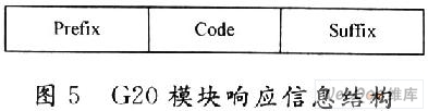 每当G20模块接收到指令时都会输出相关的响应信息,以显示指令的执行结果。响应信息的数据格式如图5所示。响应信息由3部分组成:前缀、响应代码和后缀。其中,前缀和后缀一样,均为回车和换行符,即“”;不同指令在不同情况下的响应代码也不一样。