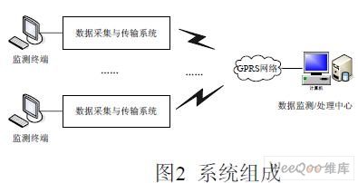 监测终端采集的数据经GSM网络接口功能模块对数据进行解码处理,转换成在公网数据传送的格式,通过GPRS网络进行传输,最终传送到监测中心。