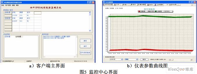 使用基于GPRS网络的远程数据采集技术可以方便快捷地为油田架构一个远程测控系统,实 现数据的采集、远传、接收、数据信息的处理分析、远程控制等功能。文章实现的系统现应用 于北京荣源世纪科技有限公司,主要由远程测控终端和监控中心2部分组成,运行效果良好,如 图5所示。