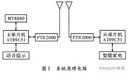 本系统首先通过电话线利用DTMF收发电路芯片MT8880实现远程访问,再利用主单片机AT89C51的串口把各种访问、控制信息,传送给无线数传 MODEM芯片PTR2000,通过PTR2000实现数据的无线传送;而作为智能家电的接收端,首先通过外接PTR2000接收到主机发送的控制和访问信息,然后传送给从单片机AT89C51以实现各种功能的控制。系统原理电路,如图1所示。