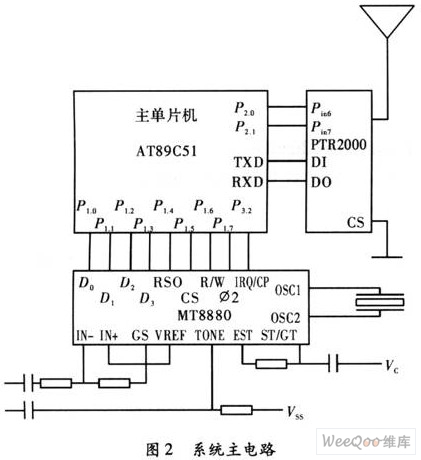 主单片机AT89C51的P1.0~P1.3分别接入MT8880的D0~D3;单片机AT89C51的P1.4~P1. 7分别接入MT8880的RSO、CS、R/W、02,单片机AT89C51的P3.2接MT8880的IRQ/CP,具体电路,如图2所示。