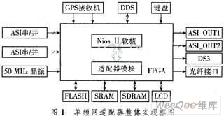 图1中,FLASH,SRAM和SDRAM用来存储FPGA的配置信息和系统控制程序,DDS模块用来产生输出码流所需时钟。通过键盘和LCD接口,用户可设置系统的工作模式,了解系统的工作状态。2路ASI码流经过专门的接口芯片后输入到 FPGA,适配器模块根据用户的设置在码流中插入相应的MIP包,最终输出为2路ASI接口的码流,一路光纤接口的码流,一路DS3接口的码流。